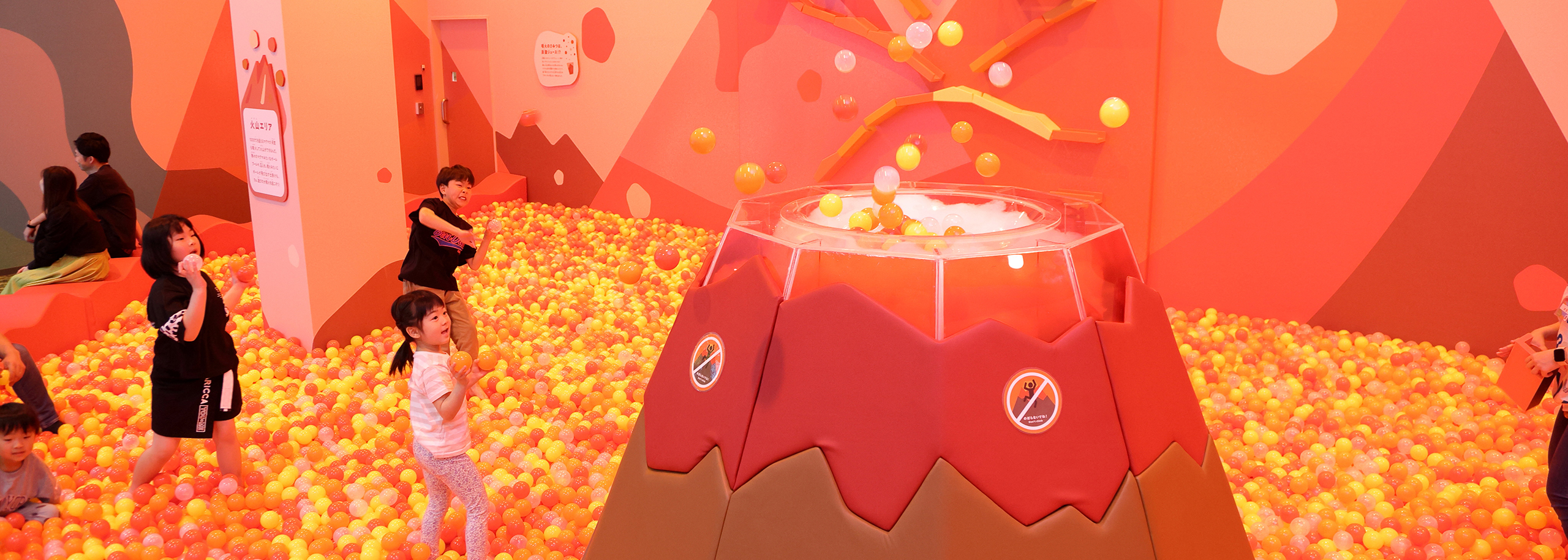 「氷山」「火山」「地層」など自然をモチーフにした各エリアには、氷山の山をイメージした滑り台やボールが飛び出す火山、砂に触れる感覚を楽しめる砂場、定期的に開催するSDGsや自然の大切さを学べるワークショップなど、屋内にありながら自然とふれあうように子どもたちの「こころ・からだ・あたま」の成長を促す、楽しいあそびがたくさん詰まっています。