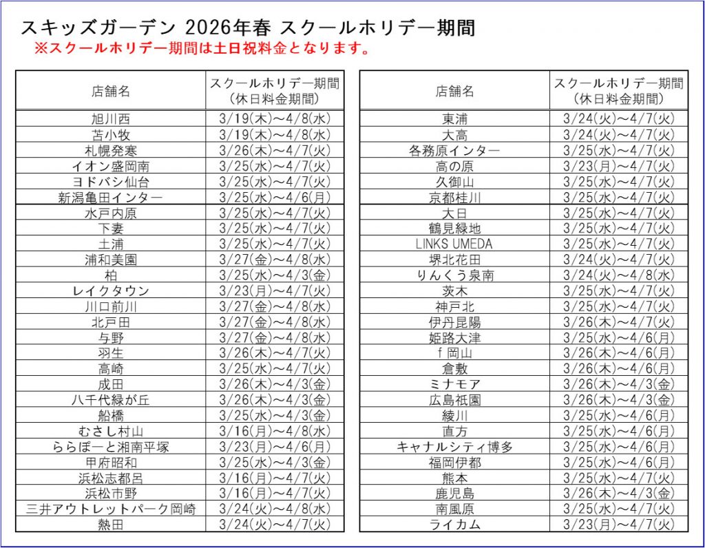 スクールホリデー期間は土日祝料金となります。 料金は各店舗のご利用料金欄をご確認ください。