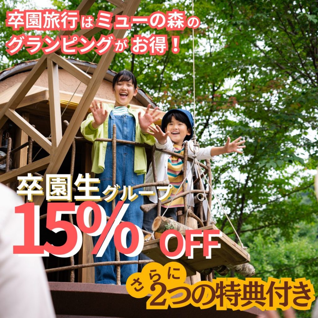 【卒園生15%オフ・特典付き】1泊2食付き グループでの卒園旅行にも!観光地への移動不要アクティビティも楽しめる山梨グランピング
