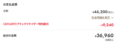 4.「【20%OFF】ブラックフライデー特別割引」・割引額が赤字で表示されたことを確認。