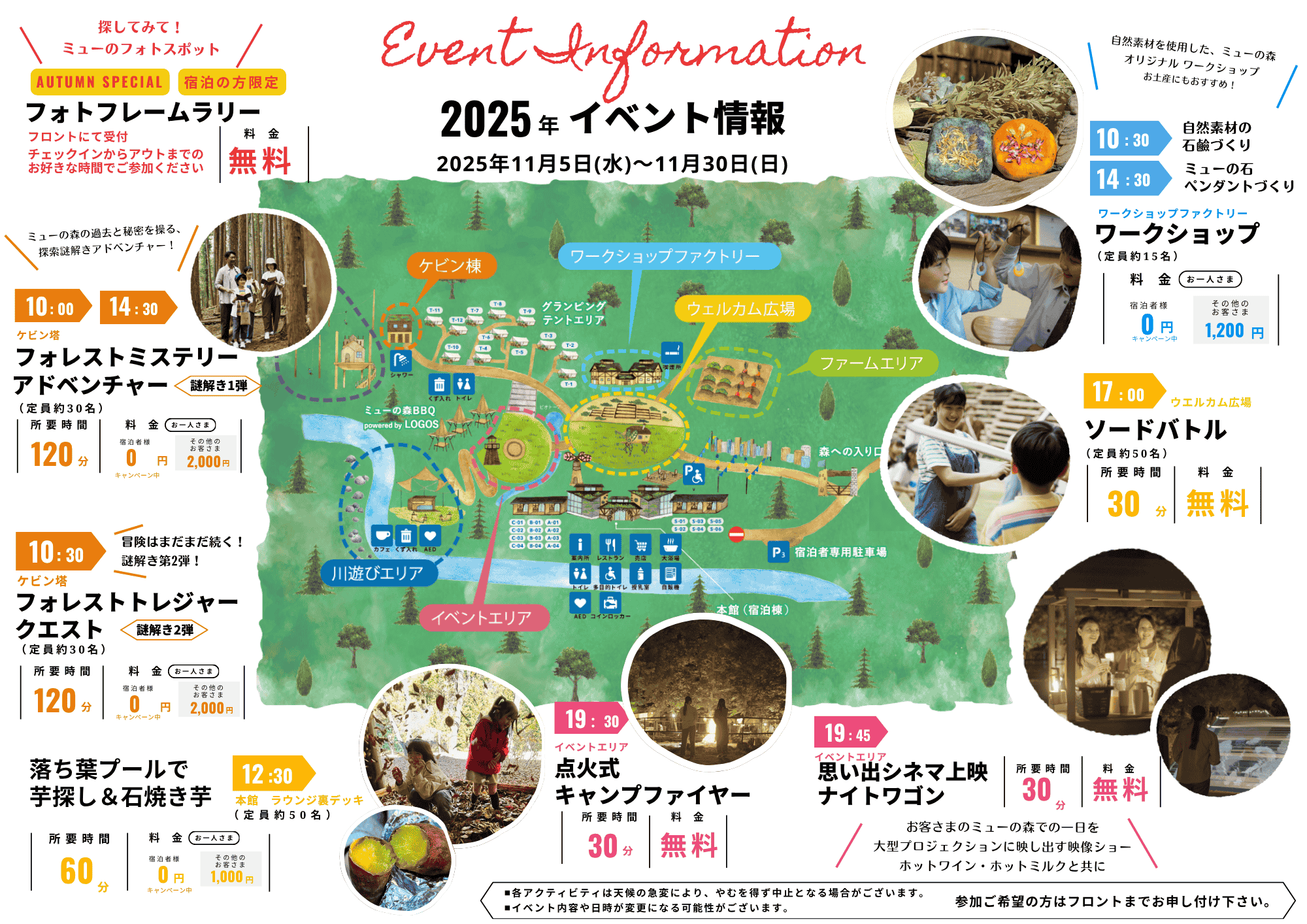 - 期間中、ご宿泊の方は通常有料となる「謎解きフォレストミステリーアドベンチャー」(通常宿泊の方は1,500円) や、旅のお土産にもぴったりなものづくりワークショップ「ミューの石ペンダントづくり」(通常1,200円) など、様々な好奇心を刺激するプログラムに、追加料金なしでご参加いただけます。