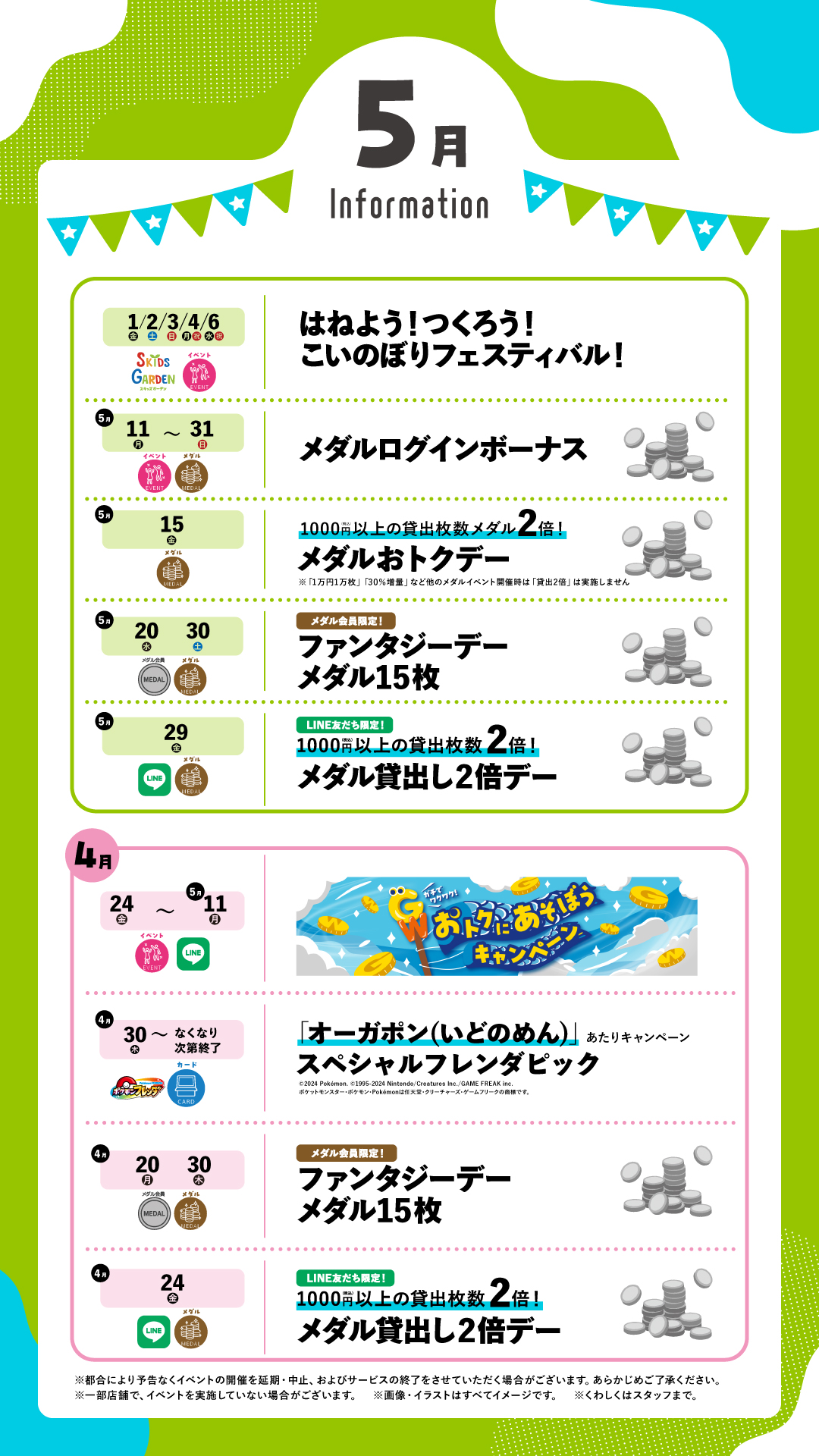 GWおトクにあそぼうキャンペーン「①LINE友だち限定メダルクーポン」プレゼント!