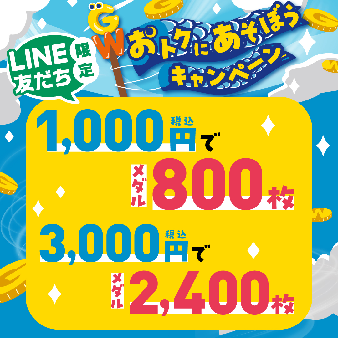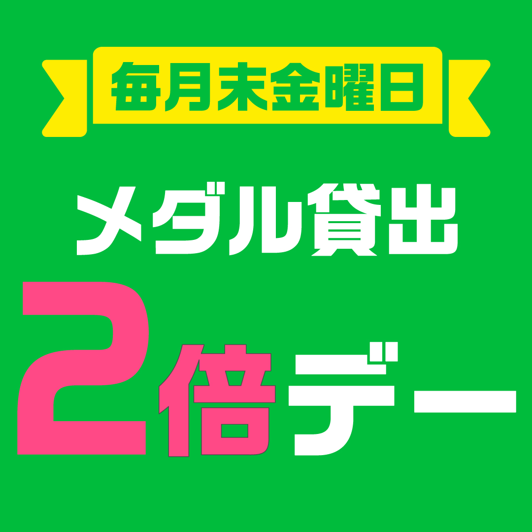 LINE友だち限定で、毎月末金曜日にメダル1,000円以上の貸出し枚数が2倍になる「メダル貸出2倍デー」を開催!