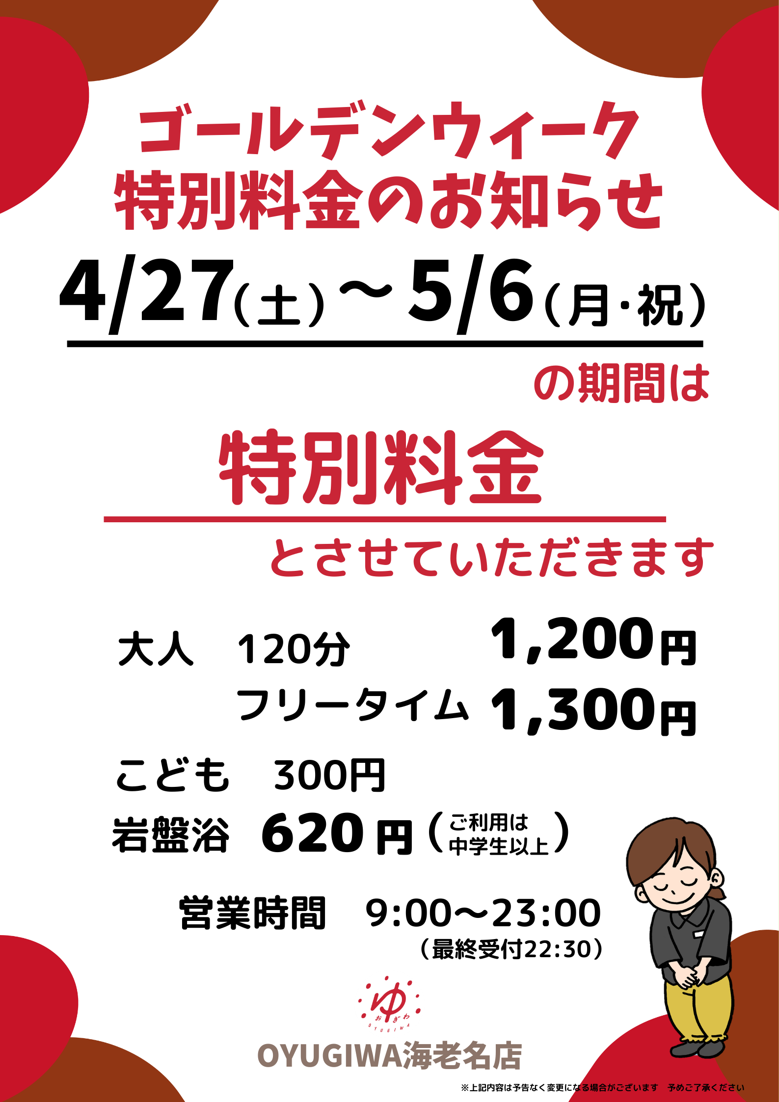 4月27日(土)~5月6日(月・祝)までの期間は、ゴールデンウィーク特別料金とさせていただきます。