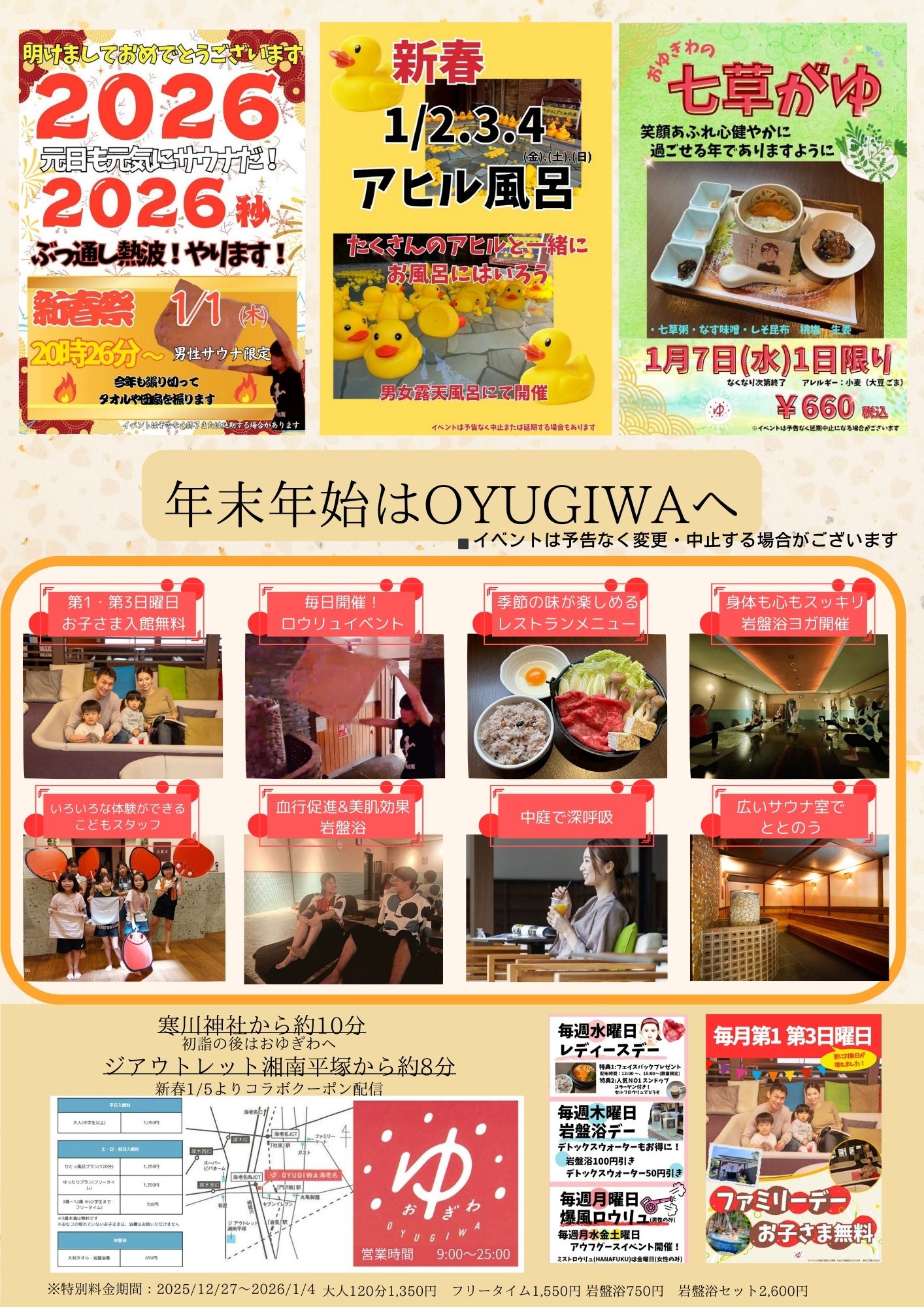 イベント 2026/01/01 年末年始のチラシが出来ました! OYUGIWAは年末年始もたくさんのお客様で賑わう事を願いたくさんのイベントを用意してお待ちしております。年末年始のイベントをまとめました。 施設トップへ戻る