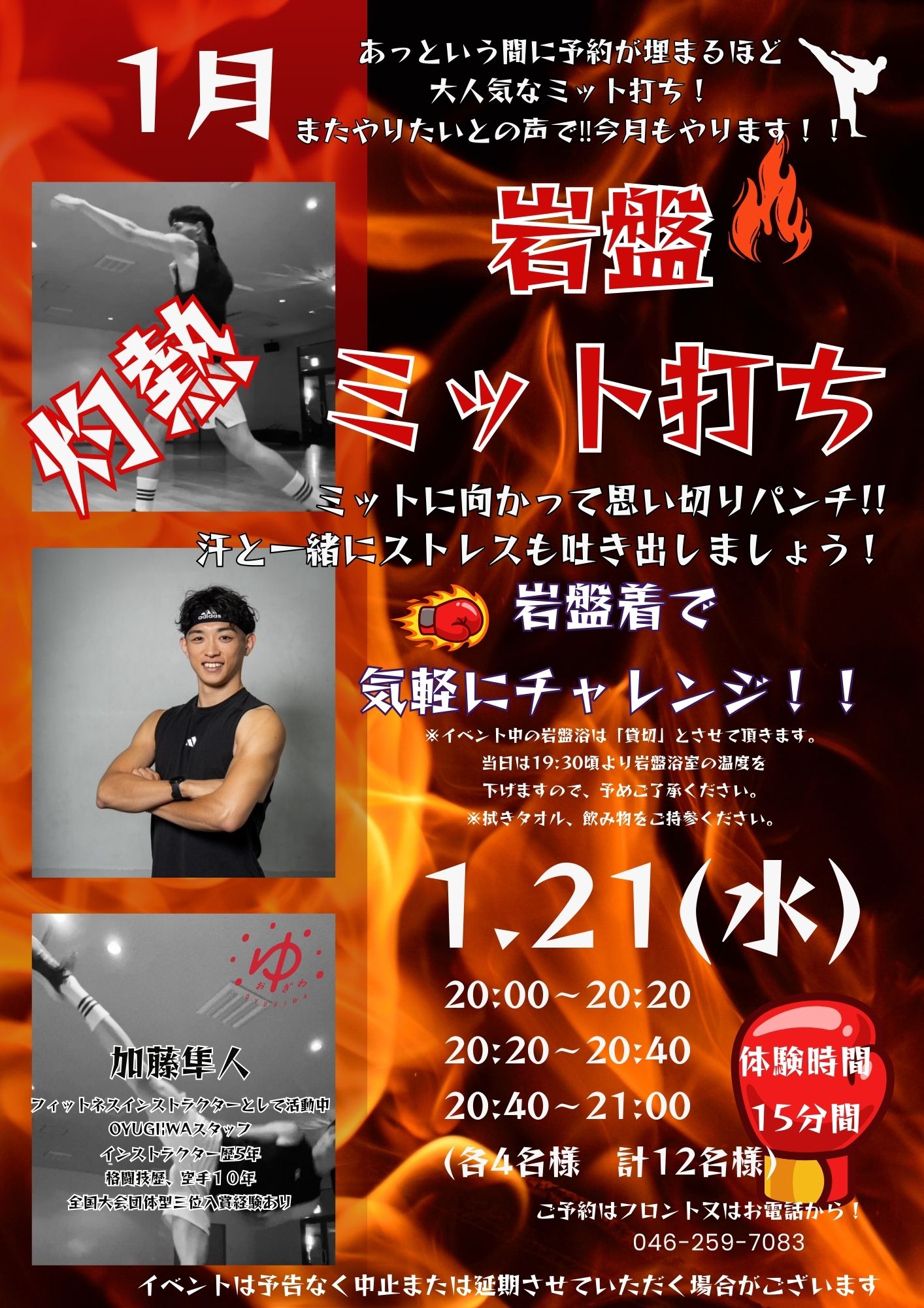 イベント 2026/01/21 1月岩盤浴室でミット打ち 今月もやります!岩盤ミット打ち!初心者でも楽しめる大人のプログラム終わった後のスッキリ爽快♪味わってみませんか? ご予約はフロントまたはお電話にてお待ちしております。 施設トップへ戻る