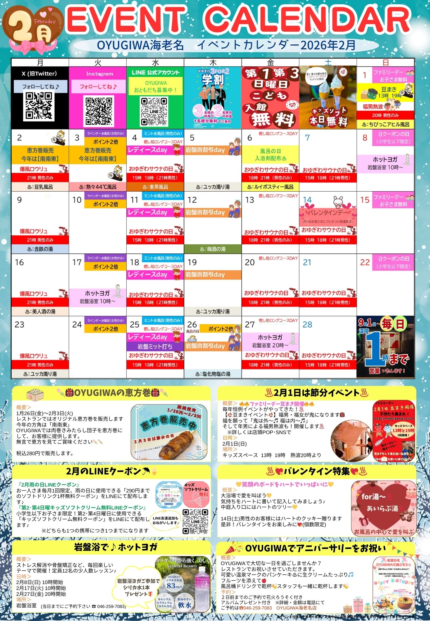 2月もたくさんのイベントを準備しております。寒いこの季節はゆっくりと暖かいお風呂に浸かって日頃の疲れをお取りください♪