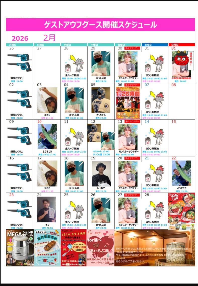 イベント 2026/02/01 2月熱波師カレンダー 2月のゲスト熱波師とスタッフ熱波のお時間など載ったカレンダーです。予定は変更または追加になる場合がございますので店頭ポスターでもご確認お願いします。 施設トップへ戻る