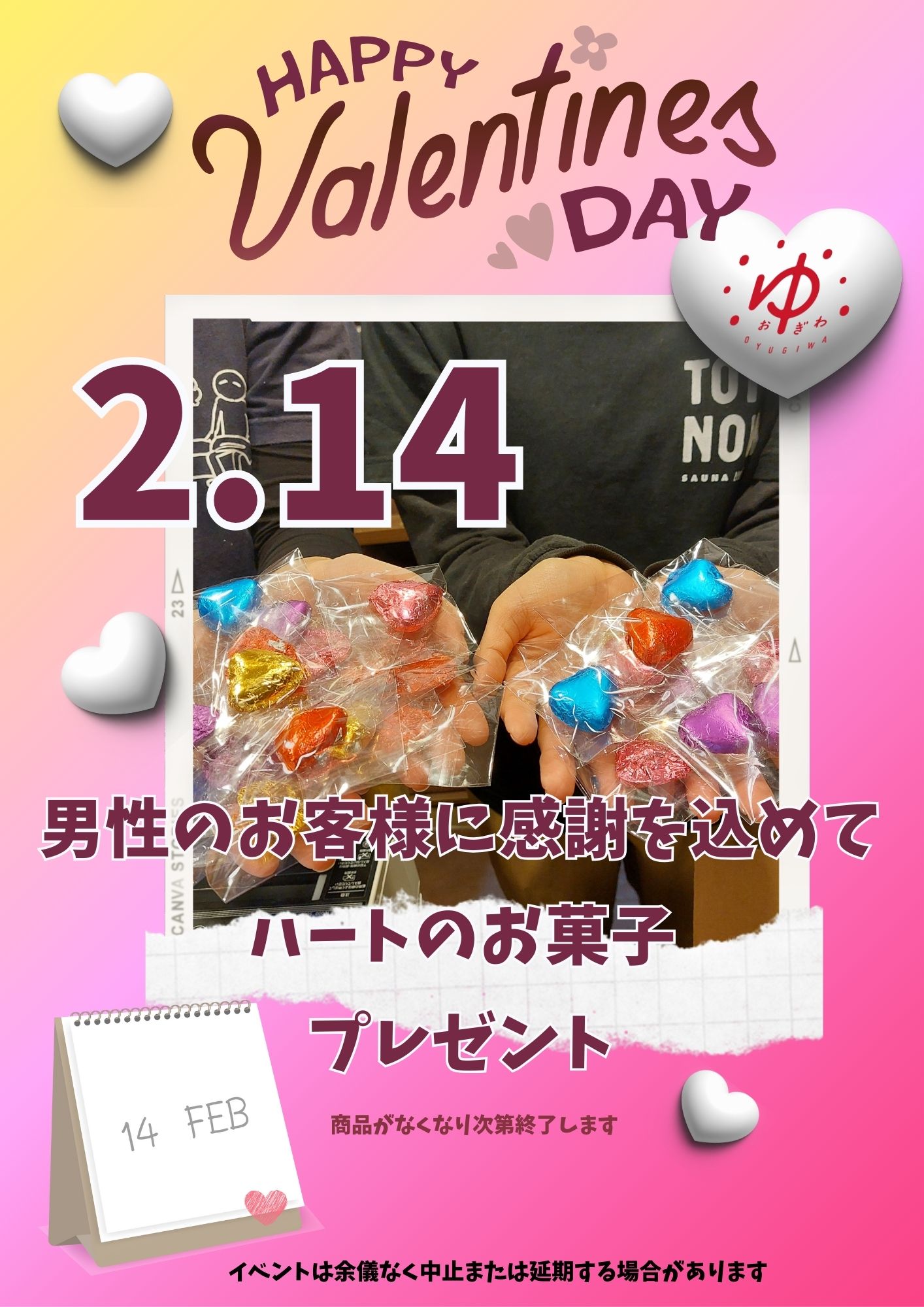 イベント 2026/02/14 2/14(土) バレンタインデー 今年も男性のお客様にはハート💛のお菓子をプレゼントします。数量限定になります。ちょっぴりかわいいOYUGIWAからのプレゼント♪です。 施設トップへ戻る