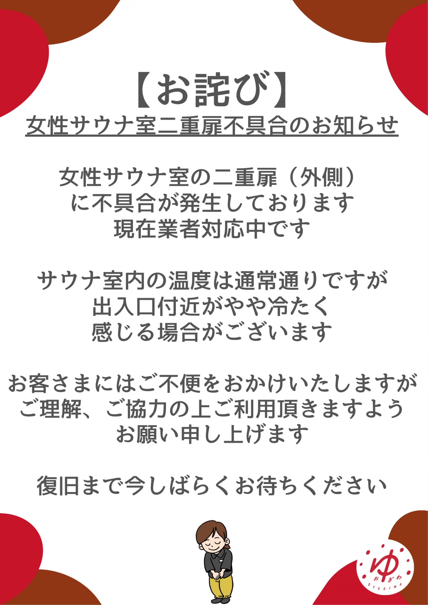 女性サウナ室の二重扉(外側)に不具合が発生しており、現在業者にて対応中です。