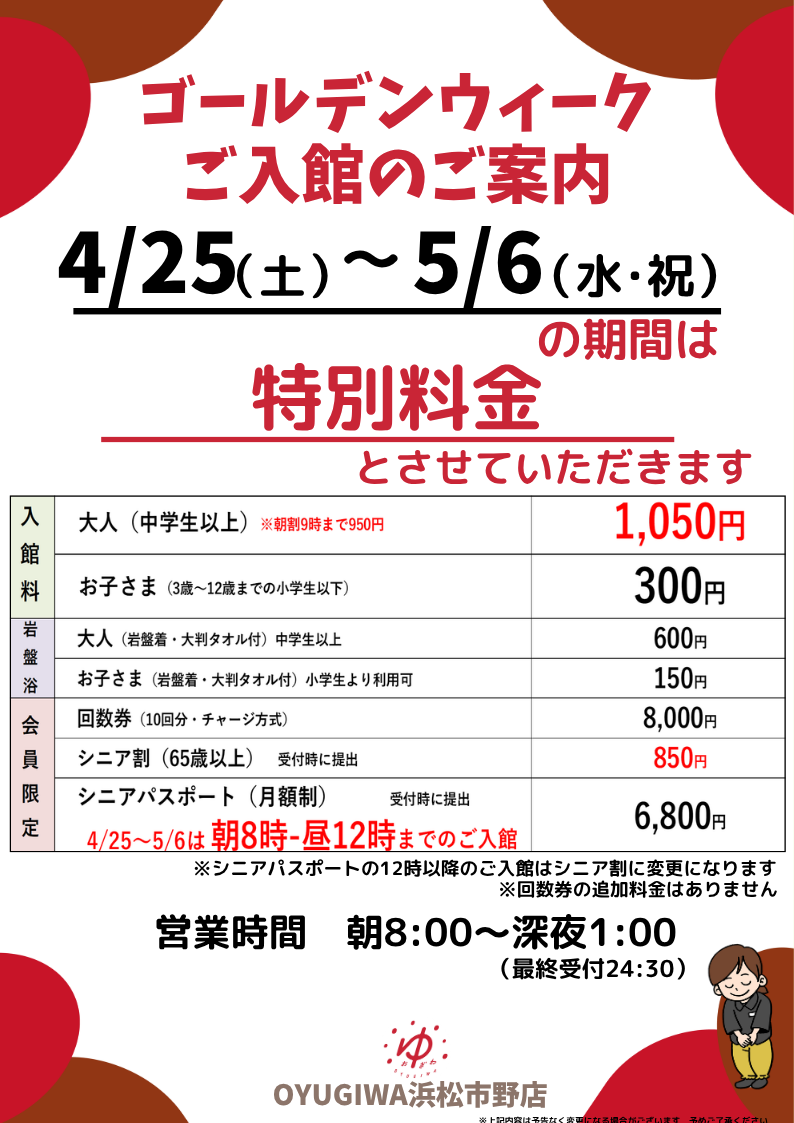 4月25日(土)~5月6日(水・祝)までの期間は特別料金とさせていただきます。